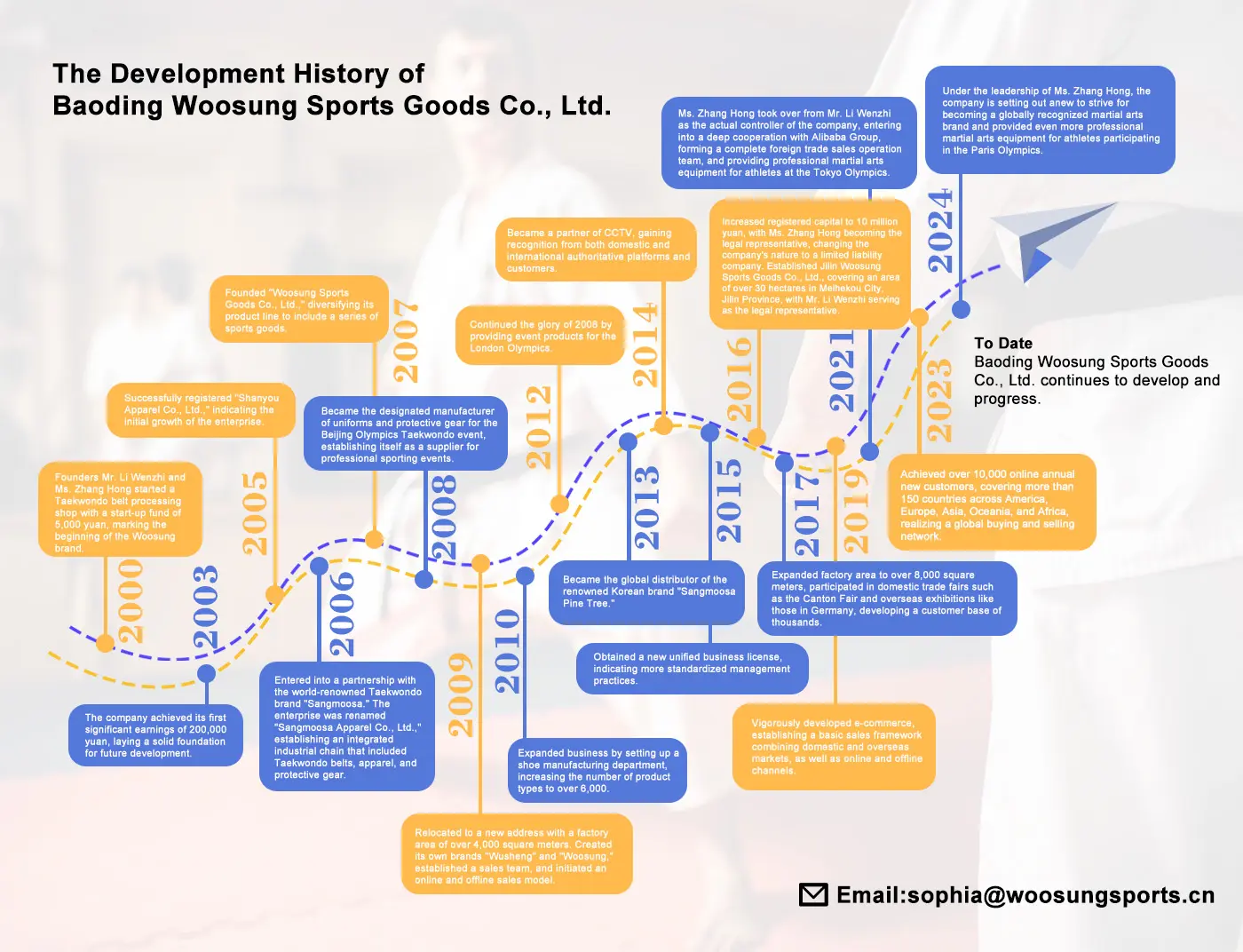 Woosung Sports Co. Co., Ltd. 2006 жылы құрылған және тәуелсіз импорт және экспорттық құқықтары бар спорттық тауарлар өндірушісі болып табылады. Компания ең алдымен таеквондо, каратэ, бокс және дзюдо, соның ішінде таеквондо формалары, қорғандар, аяқ киім, карат формалары, белбеулер, белбеулер, қорғаныс редукторлары, бокс қолғаптары, бөрене, бокс аяқ киімдері, бокс аяқ киімдері, бокс киімдері. Сонымен қатар, компания жекпе-жек өнері жабдықтарының, спорттық пакеттердің, йога өнімдерінің және спортзалға кең ауқымды түрде ұсынады. Сондай-ақ, Woosung сонымен қатар Over Entersem Protections үлгісін және OEM өңдеу қызметтерін ұсынады, бұл оны ашық ауада энтузиастар үшін ең жақсы таңдау жасайды.